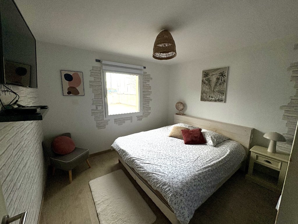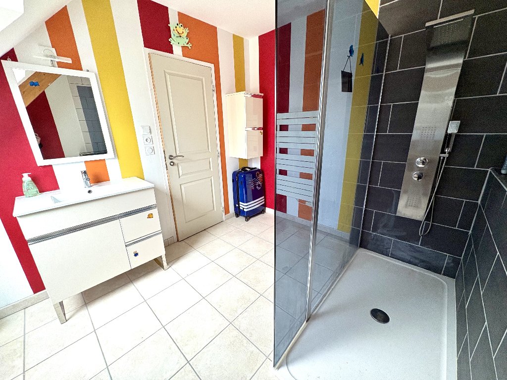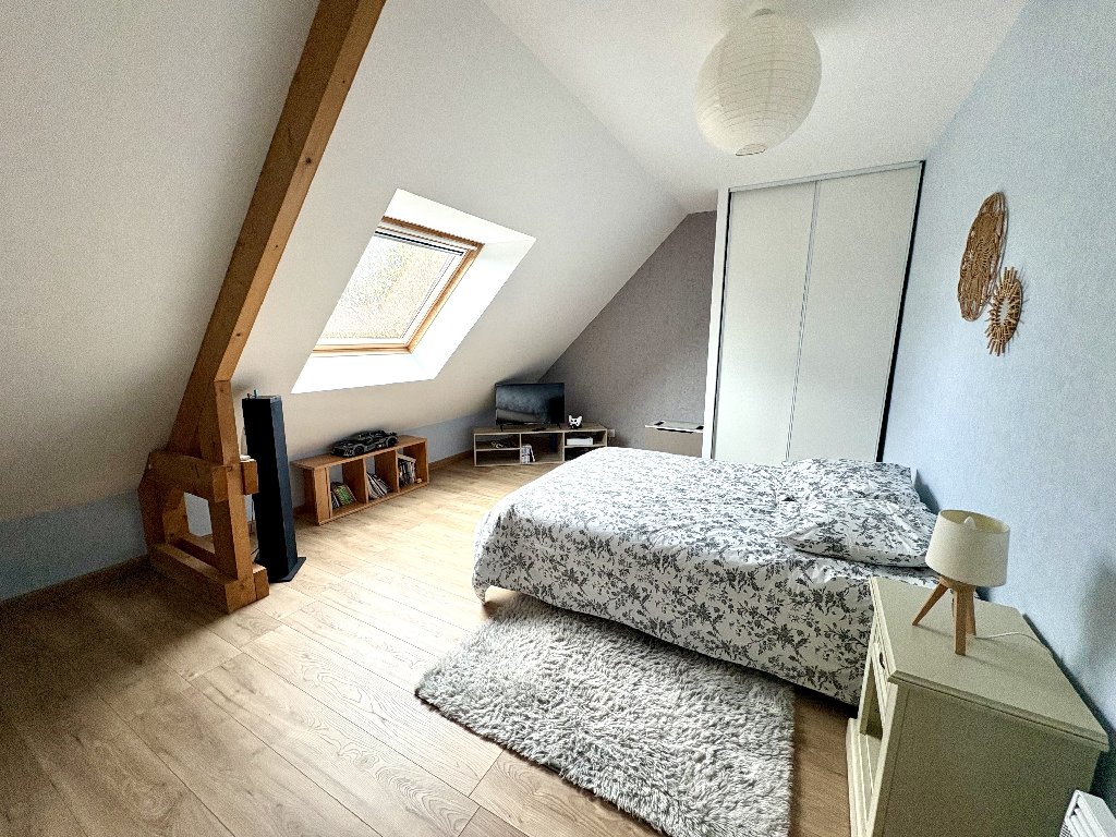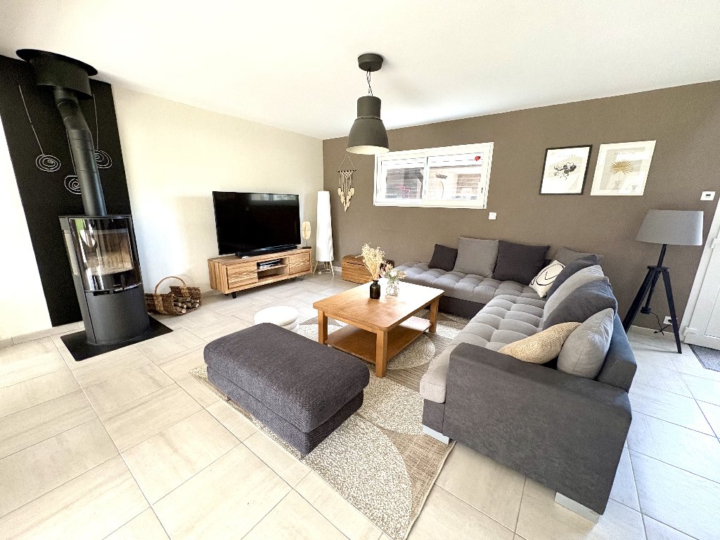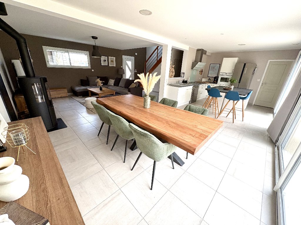 Le salon est agrémenté d’un poêle à bois, apportant une atmosphère chaleureuse et cosy. La maison dispose de 4 chambres, dont une permettant une véritable autonomie de plain-pied.
