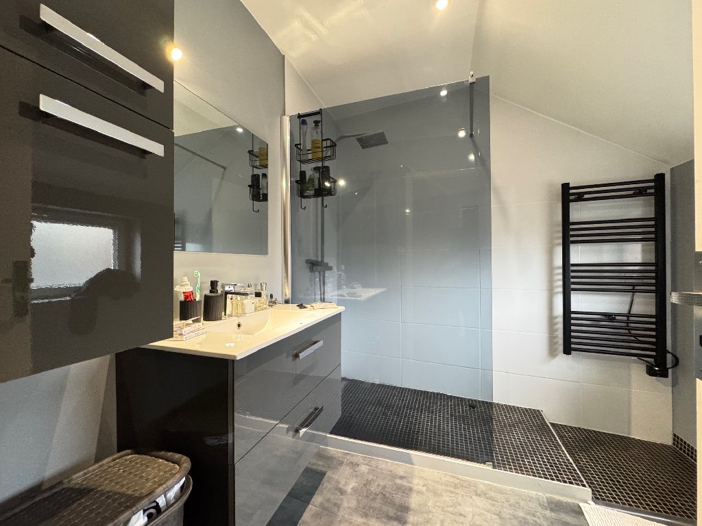 RDC : Hall avec placards, une grande chambre avec placards, salle d'eau, Wc séparé avec lave mains, une buanderie et un cellier.